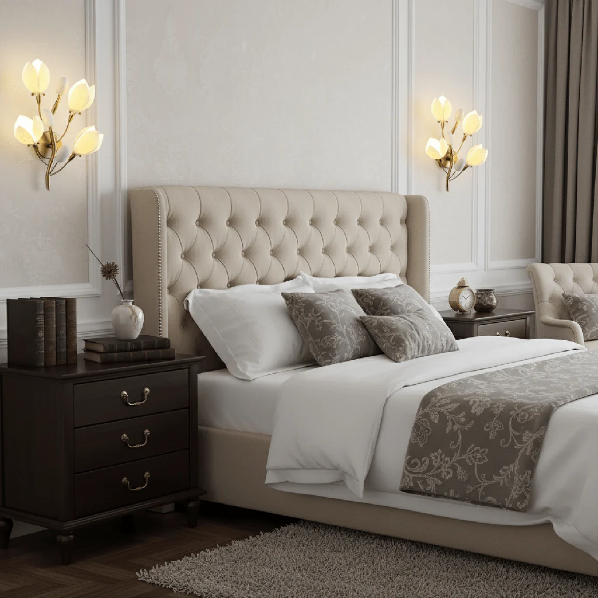 Ispirata alla grazia naturale dei fiori che sbocciano, questa lampada da parete trasforma qualsiasi spazio in un giardino sereno e luminoso. Ogni paralume a forma di petalo è delicatamente realizzato in ceramica ed emette una luce morbida e calda che evoca calma e bellezza. La struttura ramificata, rifinita in oro spazzolato, rispecchia il dolce movimento della natura, elegante, scultorea e senza tempo.