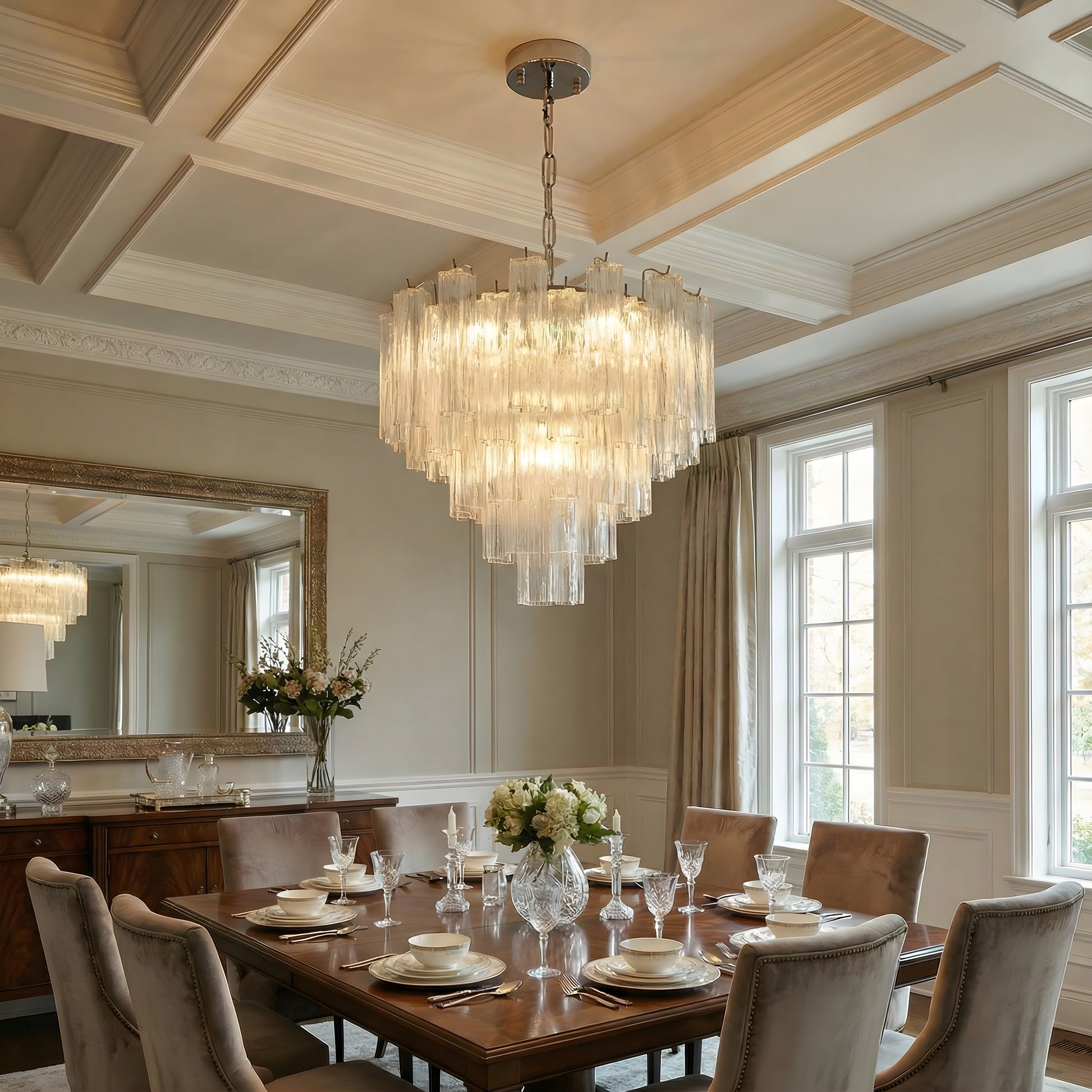 Questo lampadario crea un'atmosfera di raffinata eleganza con i suoi livelli di vetro a cascata che diffondono e ammorbidiscono la luce. Il suo design lussuoso eleva immediatamente la stanza, fondendo il fascino classico con la raffinatezza moderna. Realizzato con materiali di prima qualità e con un'eccezionale attenzione ai dettagli, aggiunge non solo illuminazione ma anche un senso di grandezza a qualsiasi sala da pranzo o spazio abitativo.
